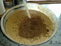 Se adauga galbenusrile , se bate pana se omogenizeaza, apoi se adauga treptat apa si uleiul.Se adauga treptat praful de copt, faina si cacaoa si se amesteca bine.